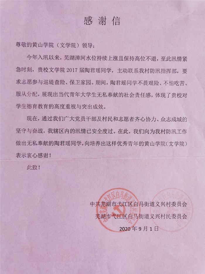 近日,jbo竞博官网收到芜湖市弋江区白马街道义兴村民委员会的感谢信,对该院17级汉语言文学专业2班陶君瑶同学志愿参与该村抗洪抢险、保卫家园的行为表示感谢。